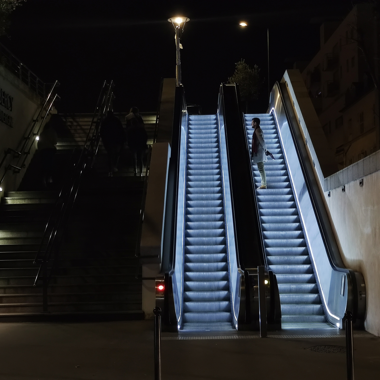 Derrière les vitres, parfois, un éclat intérieur trahit la vie : un bureau encore allumé, un appartement qu’un verre dépoli ne parvient pas à dissimuler tout à fait. Ces fragments d’intimité éveillent la curiosité du regardeur sans jamais la satisfaire. Ailleurs, la lumière révèle une architecture insoupçonnée, dévoile des détails qu’en plein jour nous ne percevons plus. Elle transforme les lieux en décors de cinéma, oscillant entre mystère et beauté, inquiétude et fascination.